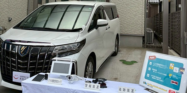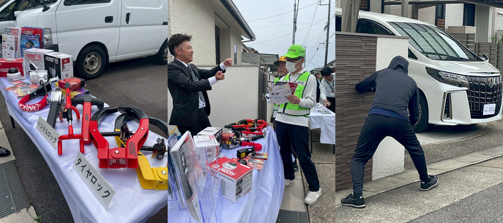 ●その他、犯人がドアを開けると「警報装置」から大きな音が鳴り、スマホに通知、車が盗まれても取り戻すために追跡できる装置、ハンドルロック、タイヤロック、リレーアタック対策ケースなどを紹介し、設置を呼びかけました。