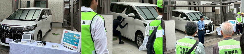 犯人役の警察官が車を盗む過程を実演しました。「防犯三種の神器」がどのように作動するのか防犯効果を実演しました。